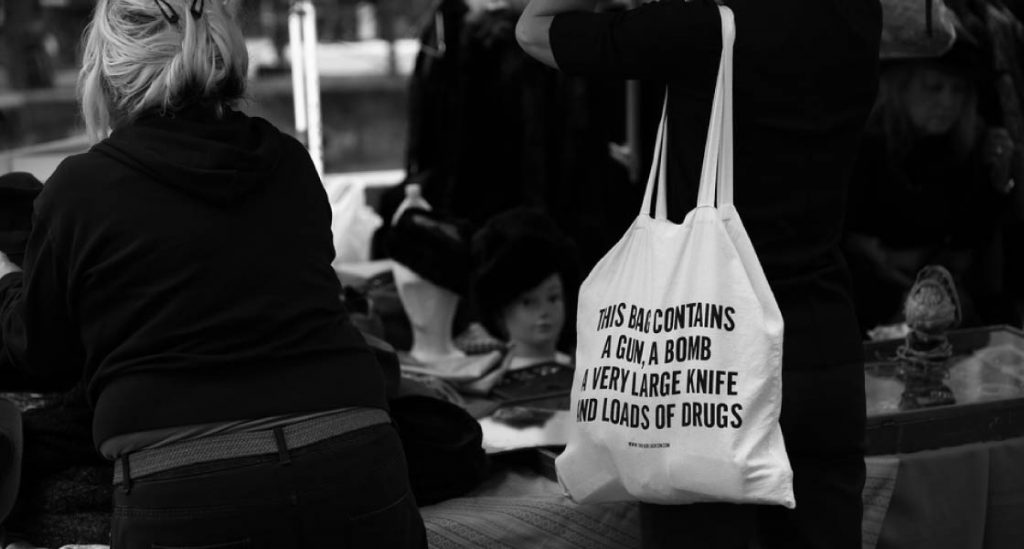 Le tote-bag vecteur de logos en tout genre, mais aussi de blagues (douteuses) pour les douaniers.